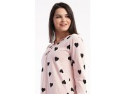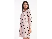 Dámská bavlněná noční košile s dlouhým rukávem Srdce. Noční košile s kulatým výstřihem a légou na knoflíčky má příjemnou délku nad kolena. Látka košile je potištěna srdíčky, dlouhý tukáv je zakončen manžetou. Použitý materiál s podílem bavlny 100% je příjemný a poddajný na dotek.
