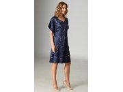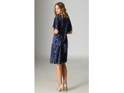 Dámská saténová noční košile s krátkým rukávem Měsíc a hvězdy. Noční košile s příjemnou délkou po kolena má krajku na ramenou a pásek na stáhnutí. Tmavě modrá látka košile je potištěna drobnými hvězdami. Použitý saténový materiál je příjemný a poddajný na dotek.