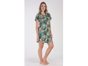 Dámská bavlněná noční košile s krátkým rukávem Michaela. Dámská noční košile s kulatým výstřihem má příjemnou délkou nad kolena. Košile s krátkým rukávem je potištěna motivy džungle, převažuje smaragdová barva. Použitý bavlněný materiál je příjemný a poddajný na dotek.