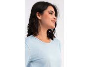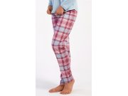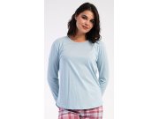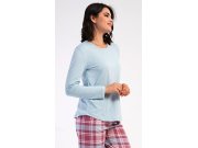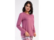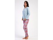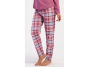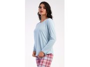 Dámské bavlněné dlouhé pyžamo Dominica. Dámské pyžamo se skládá z trika s dlouhým rukávem a dlouhých kalhot. Triko je jednobarevné, bez potisku, má kulatý výstřih. Kárované kalhoty mají v pase gumu a šňůrku na stažení, nemají kapsy. Použitý bavlněný materiál je poddajný a příjemný na dotek.