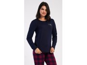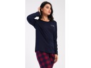 Dámské bavlněné dlouhé pyžamo Emma. Dámské pyžamo se skládá z trika s dlouhým rukávem a dlouhých kalhot. Jednobarevné triko s kulatým výstřihem zdobí na hrudi drobný nápis. Kárované kalhoty mají v pase gumu a šňůrku na stažení, nemají kapsy. Použitý bavlněný materiál je poddajný a příjemný na dotek.