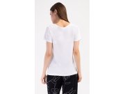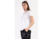 Dámské pyžamo s krátkým rukávem Fiona. Dámské pyžamo se skládá z trika s krátkým rukávem a dlouhých kalhot. Triko je jednobarevné, bez potisku, má kulatý výstřih. Kalhoty potištěné květinovým vzorem mají v pase gumu a šňůrku na stažení, nemají kapsy. Použitý viskózový materiál je poddajný a příjemný na dotek.