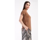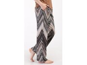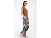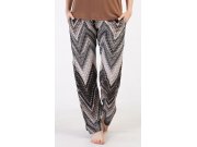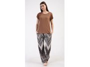 Dámské pyžamo s krátkým rukávem Julie. Dámské pyžamo se skládá z trika s krátkým rukávem a dlouhých kalhot. Triko je jednobarevné, bez potisku, má kulatý výstřih. Kalhoty potištěné geometrickým vzorem mají v pase gumu a šňůrku na stažení, nemají kapsy. Použitý viskózový materiál je poddajný a příjemný na dotek.