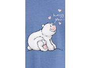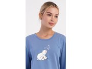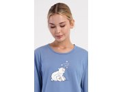 Dámské bavlněné dlouhé pyžamo Méďa a tučňák. Dámské pyžamo se skládá z trika s dlouhým rukávem a dlouhých kalhot. Triko s kulatým výstřihem je na hrudi zdobeno obrázkem ledního medvěda. Tento motiv se opakuje i na kalhotách, které mají v pase gumu a šňůrku na stažení, nemají kapsy. Použitý bavlněný materiál je poddajný a příjemný na dotek.