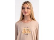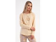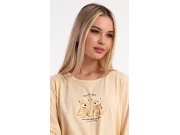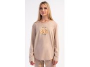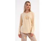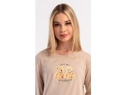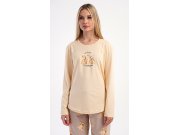 Dámské bavlněné dlouhé pyžamo Monika. Dámské pyžamo se skládá z trika s dlouhým rukávem a dlouhých kalhot. Triko s kulatým výstřihem je na hrudi zdobeno obrázkem plyšových medvědů. Tento motiv se opakuje i na kalhotách, které mají v pase gumu a šňůrku na stažení, nemají kapsy. Použitý bavlněný materiál je poddajný a příjemný na dotek.