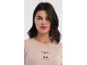 Dámské bavlněné dlouhé pyžamo Sobík. Dámské pyžamo se skládá z trika s dlouhým rukávem a dlouhých kalhot. Triko s kulatým výstřihem je na hrudi zdobeno obrázkem malého vánočního soba. Tento motiv se opakuje i na kalhotách, které mají v pase gumu a šňůrku na stažení, nemají kapsy. Použitý bavlněný materiál je poddajný a příjemný na dotek.