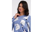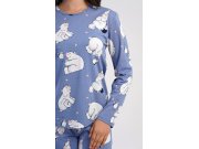 Dámské bavlněné dlouhé pyžamo Tučňák a méďa. Dámské pyžamo se skládá z trika s dlouhým rukávem a dlouhých kalhot. Triko s kulatým výstřihem je ozdobeno obrázky ledních medvědů. Tento motiv se opakuje i na kalhotách, které mají v pase gumu a šňůrku na stažení, nemají kapsy. Použitý bavlněný materiál je poddajný a příjemný na dotek.