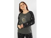 Dámské pyžamo dlouhé Vesmír. Dámské pyžamo se skládá z dlouhých kalhot a trika s dlouhým rukávem. Pyžamo je ozvláštněno potiskem astrologických a astronomických motivů, kterým dominuje velký měsíc. Pyžamové kalhoty mají v pase gumu a šňůrku na stažení, nemají kapsy. Použitý materiál je poddajný a příjemný na dotek. Triko i kalhoty jsou složeny ze 70% bavlnou.