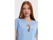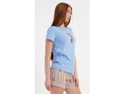 Dámské bavlněné šortkové pyžamo Bear. Dámské pyžamo se skládá z trička s krátkým rukávem a šortkových kalhot. Jednobarevné tričko zdobí obrázek medvídka. Tento motiv se opakuje i na proužkovaných šortkách, které mají v pase gumu a šňůrku na stáhnutí, jsou bez kapes. Použitý bavlněný materiál je příjemný a poddajný na dotek.