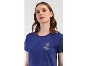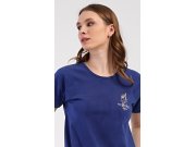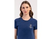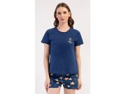 Dámské bavlněné šortkové pyžamo Hvězdy. Dámské pyžamo se skládá z trička s krátkým rukávem a šortkových kalhot. Jednobarevné tričko zdobí obrázek mušle. Šortky s potiskem mořských hvězdic mají v pase gumu jsou bez kapes. Použitý bavlněný materiál je příjemný a poddajný na dotek.