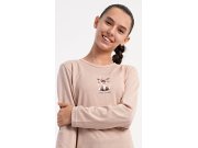 Dětské bavlněné dlouhé pyžamo Sobík. Dívčí pyžamo se skládá z trika s dlouhým rukávem a dlouhých kalhot. Triko s kulatým výstřihem je ozdobeno obrázkem malého vánočního soba. Tento motiv se opakuje i na kalhotách, které mají v pase gumu a šňůrku na stažení, nemají kapsy. Použitý bavlněný materiál je poddajný a příjemný na dotek.
