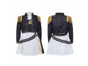 Set obsahuje stylovou třpytivou bundu, krátký top a sukni s elastickým pasem, které společně vytvářejí výrazný pódiový outfit. Pohodlný a lehký materiál zajišťuje komfort při nošení i dostatek volnosti pohybu při tanci, vystoupeních nebo hraní.