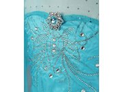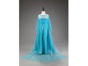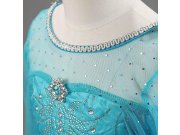 Kostým zahrnuje nádherné saténové šaty v tyrkysových modrých tónech, které září a připomínají ledové království. Šaty jsou zdobeny jemnými detaily, jako jsou flitry a kamínky nebo brož na prsou, které přidávají na eleganci. V pase je všitá pružná gumička, aby byly šaty pohodlné a dobře padly každé postavě. Dlouhé rukávy jsou vyrobeny z průhledné látky, což dodává šatům vzdušný a lehký vzhled.