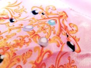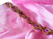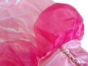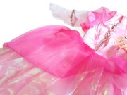 Vrchní díl šatů je vyroben z lesklé látky v růžových odstínech a zdobený třpytivými detaily, imitací šperků a jemnými krajkami. Nadýchané rukávky a živůtek doplňuje saténový pás a dekorativní prvky, které šatům dodávají elegantní vzhled. Vše je navrženo s ohledem na pohodlí při nošení.