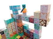 Každý blok je potištěn barevným motivem připomínajícím známé textury z herního prostředí – trávu, lávu, vodu, kovové rudy nebo dřevo. Díky tomu mohou děti nebo fanoušci Minecraftu tvořit vlastní světy, domy, hrady nebo bojové arény.