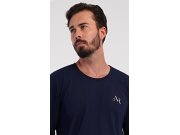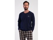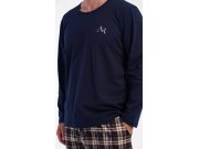 Pánské dlouhé bavlněné pyžamo Armando. Pánské pyžamo se skládá z trika s dlouhým rukávem a dlouhých kalhot. Triko je jednobarevné, zdobené na hrudi drobným obrázkem. Kostkované kalhoty mají v pase gumu, šňůrku na stažení a praktické kapsy. Použitý materiál s obsahem bavlny 100% je poddajný a příjemný na dotek.