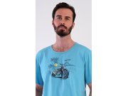 Pánské bavlněné šortkové pyžamo Pavel. Pánské pyžamo se skládá z trička s krátkým rukávem a krátkých šortkových kalhot. Na jednobarevném tričku je obrázek terénní motorky. Šortky mají praktické kapsy, v pase gumu a šňůrku na stáhnutí. Použitý materiál s podílem bavlny 100% je příjemný a poddaný na dotek. Pyžamo je vhodné i na denní nošení a oceníte ho obzvlášť v horkých letních dnech.