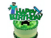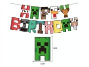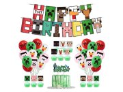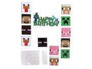Sada zahrnuje barevný banner Happy Birthday s motivy známých postav ze světa Minecraft, zápichy na cupcakes, dekoraci na dort a tematické balónky s typickými pixelovými tvary a postavami.